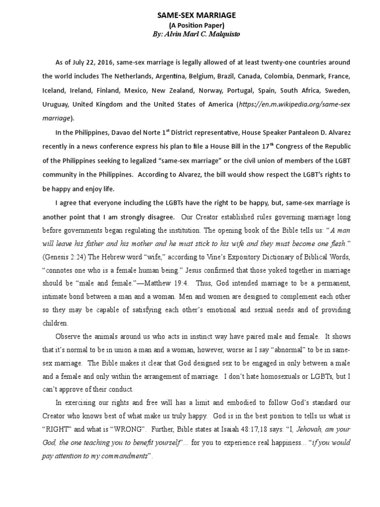 · + Words Essay on Same Sex Marriage. Love comes in all forms. It would be wrong to say that a person cannot marry someone just because they are not from the opposite sex. The world is evolving more than ever and we need to keep up with times. Same-sex marriage is when any person chooses to marry the same sex instead of the opposite. We Estimated Reading Time: 3 mins · Same Sex Marriage. Discuss the effects of Child Abuse. Discuss The indefinite detention of asylum seekers in Australia. Discuss the “Differentiate between the Historical School of jurisprudence and the Sociological School of jurisprudence.” Rough Draft Quantitative Research Critique and Ethical Considerations · Argumentative Essay on Same Sex Marriage. Introduction. For many years now, same-sex marriage has been a controversial topic. While some countries have legalized the practice, others still consider it not right and treat it as illegal. Same-sex marriage is defined as a marriage or union between two people of the same sex, such as a man and a man. Some